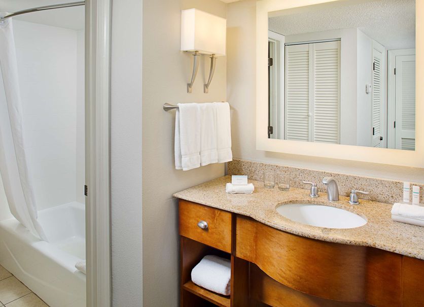 It offers guests a choice from 150 spacious one and two-bedroom suites with a fully equipped kitchen, separate living room, separate bedroom with a choice double, queen, or king size beds, and two HDTVs. The suites include a full-size refrigerator, microwave, two-burner stove, and dishwasher. Guests looking for a smaller option may choose its non-suite room furnished with a king-sized bed, an oversized chair, an ottoman, and includes a 32-inch flat-screen TV, work desk, mini-refrigerator, and small microwave. Suites include complimentary Wi-Fi, work desk and space, and phones with voice mail.