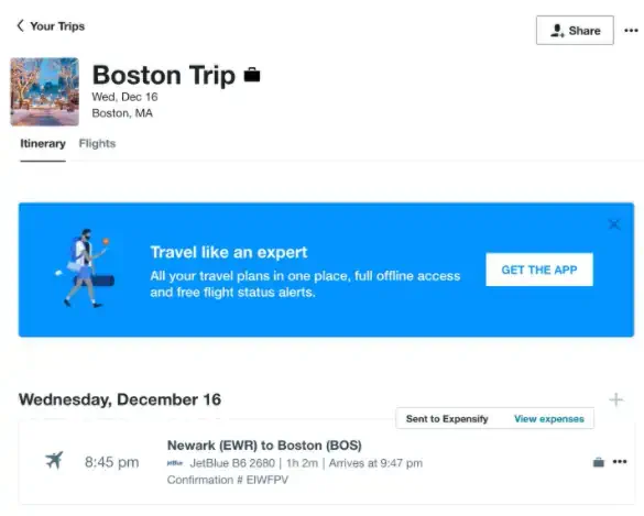 The Expensify integration means that after you book a flight or hotel, we can automatically send that receipt to Expensify.  Expensify SmartScan will take the necessary details from the receipt and create an Expense.  You will get a notification from Expensify to confirm the process has been completed.