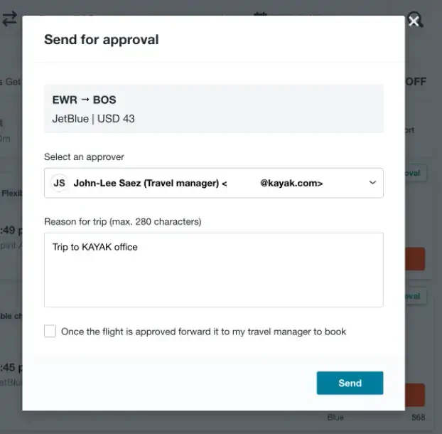 KAYAK for Business will include in your Expensify expense whether you received approval from your manager for the trip before you booked it. This means that Travellers, Managers, and Finance teams can focus instead on dealing with the bookings that were not approved!
