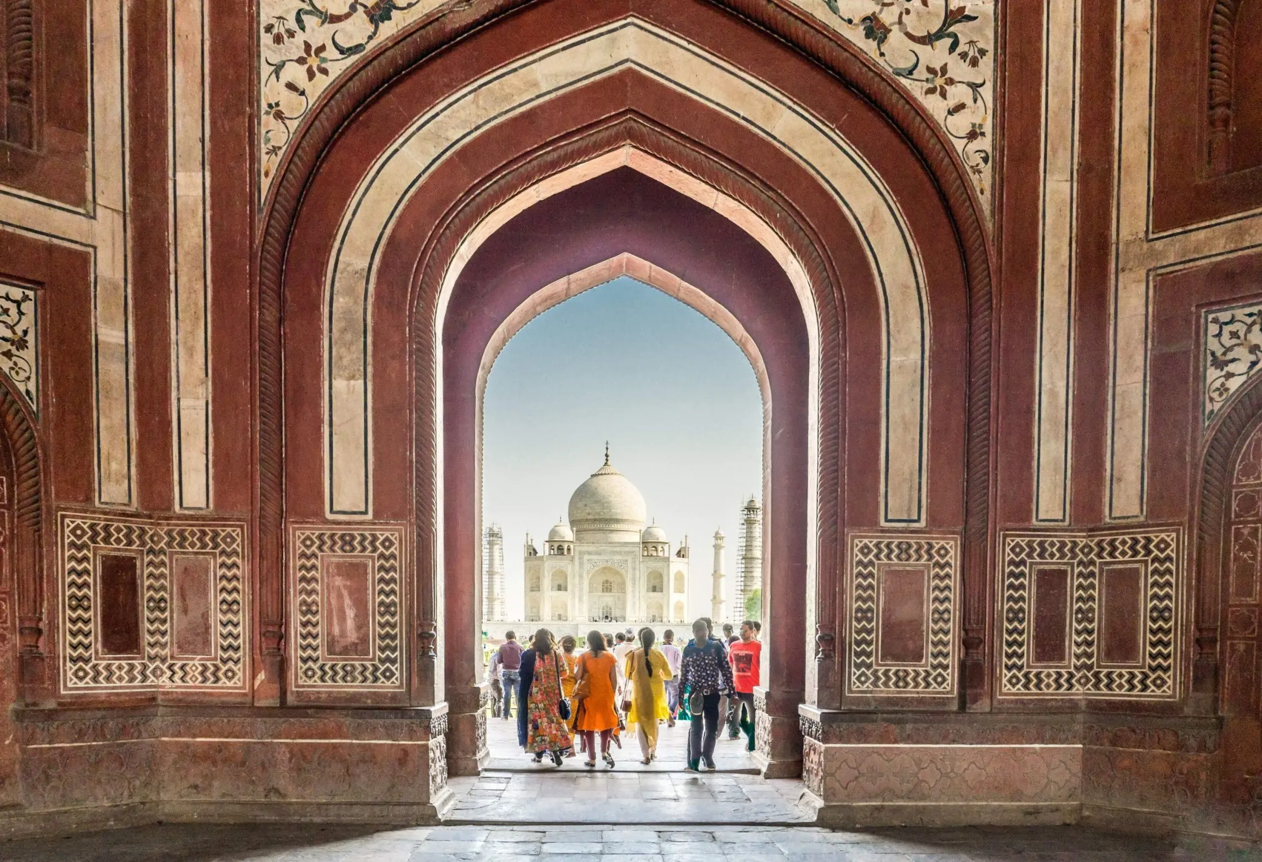 Architectural splendor: The Taj Mahal’s pristine white marble façade, adorned with intricate carvings and inlaid with semi-precious stones, reflects a blend of Persian, Islamic, and Indian architectural styles. The central dome, flanked by four towering minarets, is a symmetrical masterpiece.